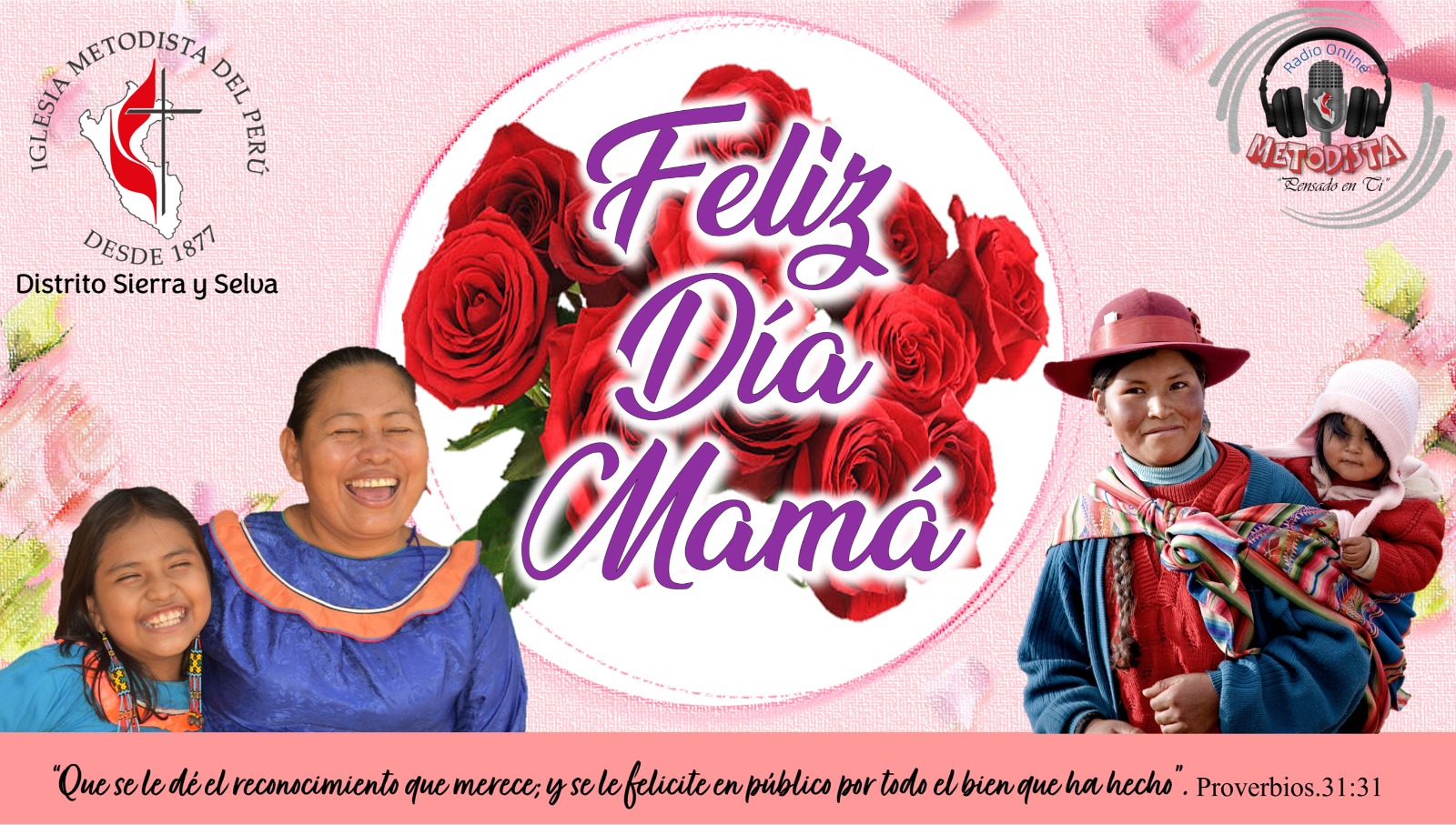 En este segundo domingo de mayo, día en que muchos hogares se colman de alegría y celebración hacemos una pausa para expresar nuestro saludo, reconocimiento y gratitud a todas las madres de nuestra Iglesia Metodista, asimismo a las madres del Perú y del mundo. Nuestra madre es aquella mujer que está con nosotros en forma incondicional quien en momentos de tristeza nos consuela; en el equívoco nos comprende; en la lucha nos presta sus armas; en el silencio nos acoge; en el error nos corrige y en la alegría nos abre su corazón.